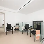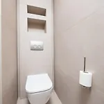 Bathroom facilities also include a separate toilet, a shower, and a washing machine. There are a hair dryer and towels for guests' comfort.